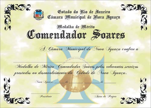Farão jus à concessão da Medalha de Mérito Comendador Soares, personalidades iguaçuanas ou não, visitantes ilustres, autoridades em geral, empresários de todos os ramos e os que tenham se destacado nas artes, nas ciências, no esporte, na cultura em geral e no desenvolvimento da Cidade de Nova Iguaçu. A Medalha será representada em metal dourado com efígie do homenageado, circundada com a inscrição “Medalha de Mérito Comendador Soares” de um lado e no outro a inscrição “Câmara Municipal de Nova Iguaçu”, acompanhada de Diploma em pergaminho.