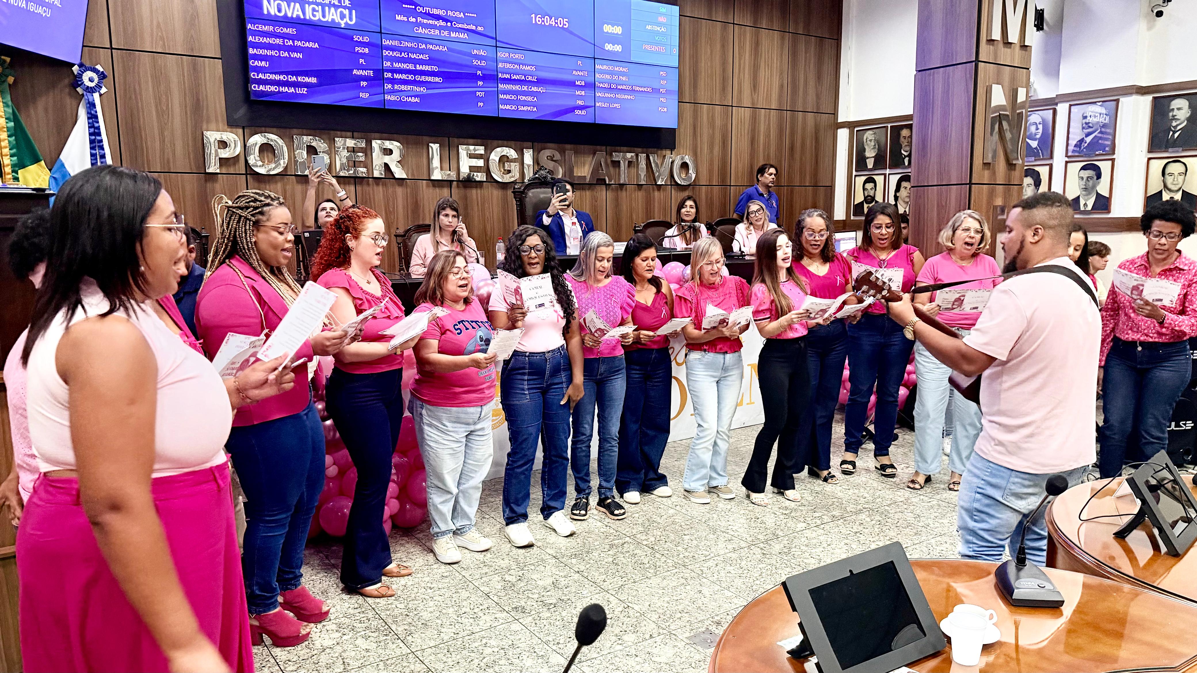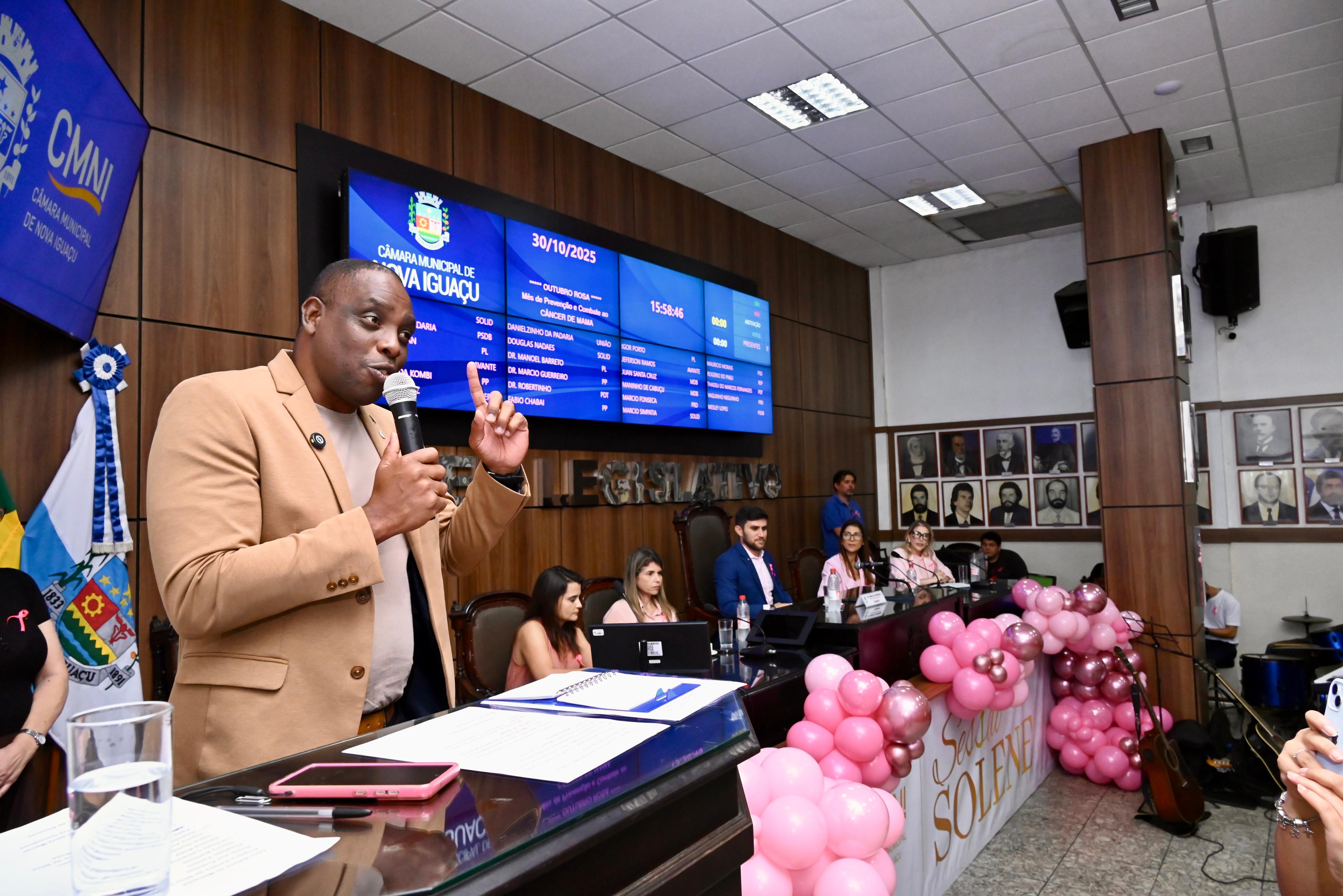 A Câmara Municipal de Nova Iguaçu promoveu, na última quinta, dia 30/10, uma Sessão Solene em alusão ao Outubro Rosa — campanha que mobiliza pela conscientização sobre o câncer de mama e a importância da prevenção. A solenidade, presidida pelo presidente da Casa, Dr. Marcio Guerreiro, com a participação da vice-prefeita Dra Roberta e da secretária de Assistência Social (Semas), Elaine Medeiros, contou com a presença de autoridades municipais, representantes da sociedade civil, profissionais de saúde e mulheres que venceram ou estão enfrentando o câncer de mama.